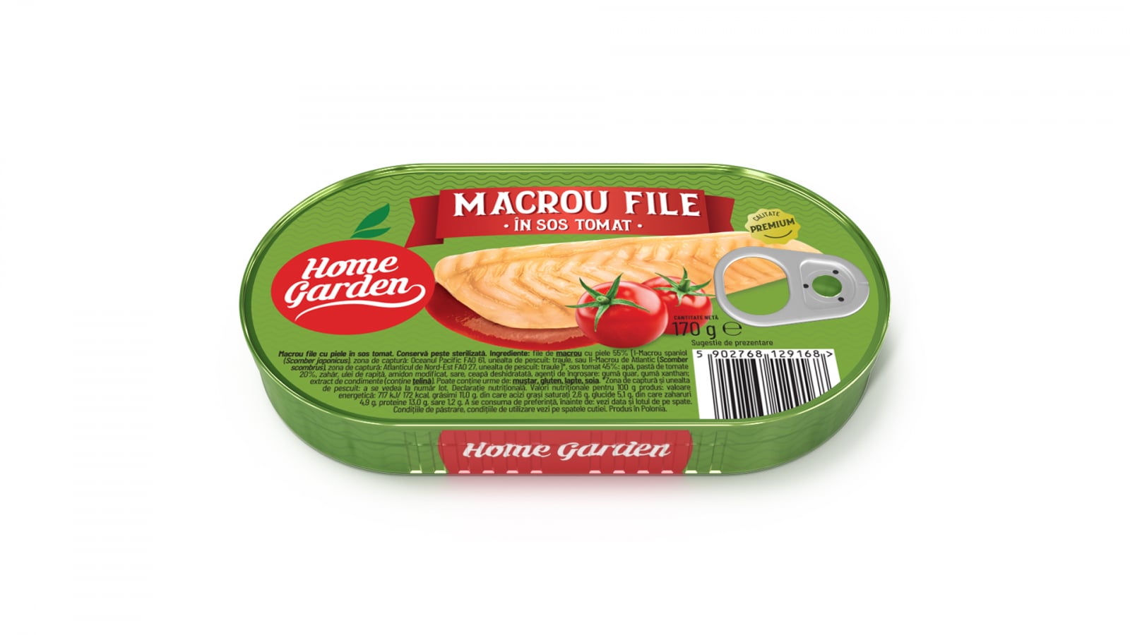 Ingrediente:file de macrou cu piele (55% peste inainte de sterilizare), sos de tomate (45% sos inainte de sterilizare): apa, pasta de tomate, zahar, ulei de rapita, faina de cartofi, sare, ceapa uscata, agenti de ingrosare (guma de xanthan), pastarnac uscat, condimente, extracte de condimente (TELINA, piper), regulator de aciditate (acid acetic).