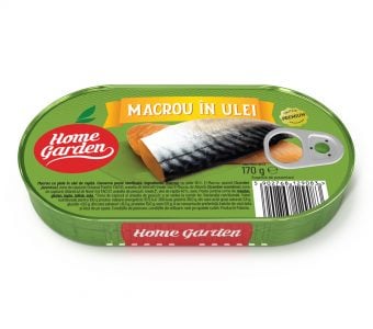 Ingrediente: file de macrou cu piele (60% peste inainte de sterilizare), ulei de rapita (40% ulei inainte de sterilizare), sare.