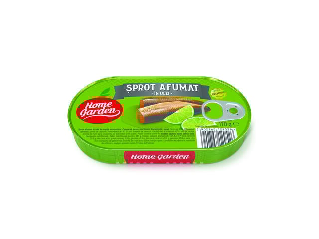 Sprot fara cap (60% peste inainte de sterilizare), ulei aromatizat (40% inainte de sterilizare) (ulei de rapita, aroma de fum, sare, regulator de aciditate (acid acetic).